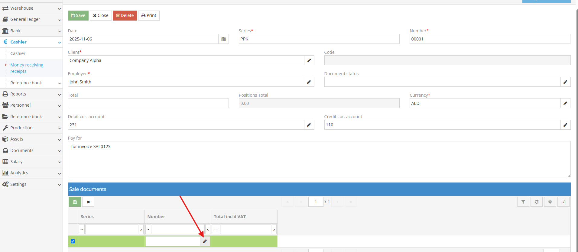 If a payment document is selected, it will not be reconciled automatically — it is for informational purposes only and will be shown when printing the Cash Receipt.
