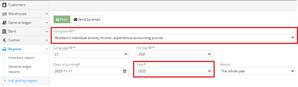 Note. If it is not possible to select the year when choosing the report, check whether the parameters for How to set parameters for the "Resident Individual Activity Income–Expense Journal"? are filled in.